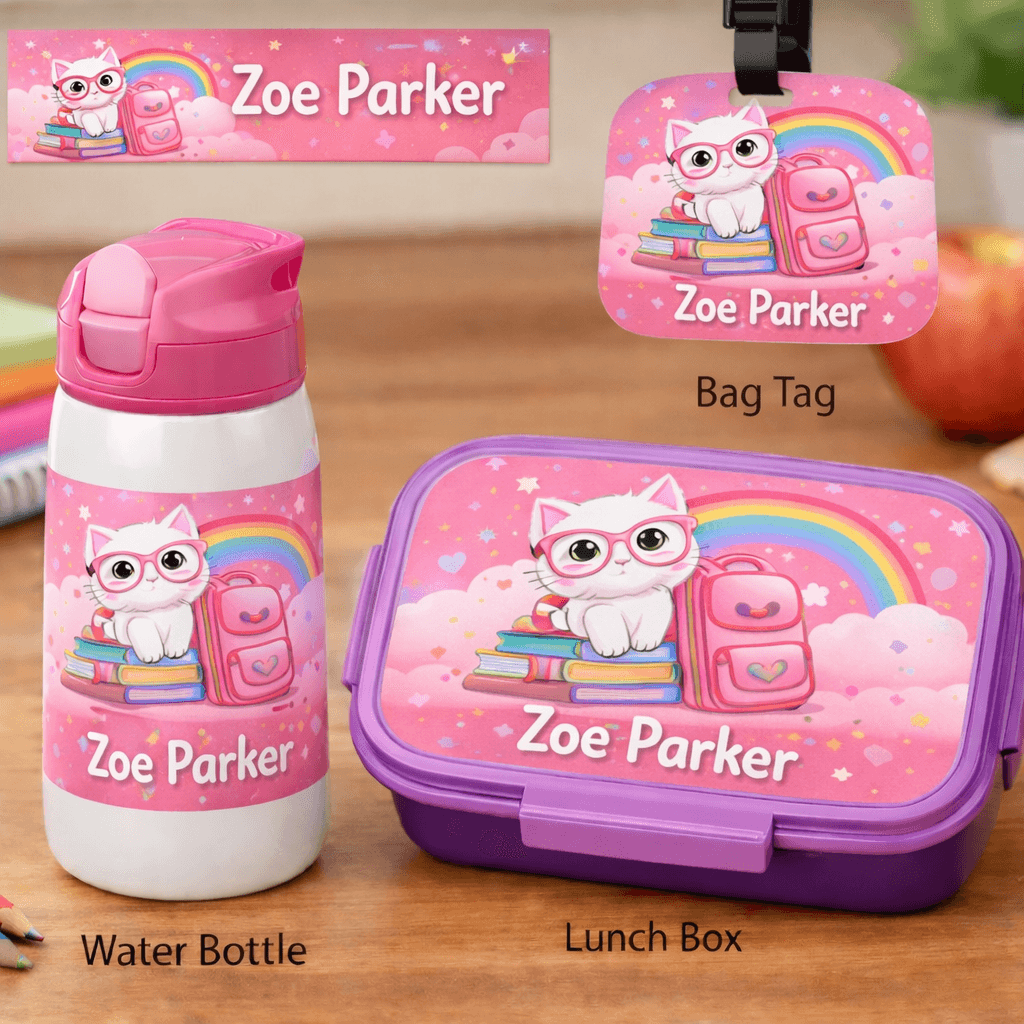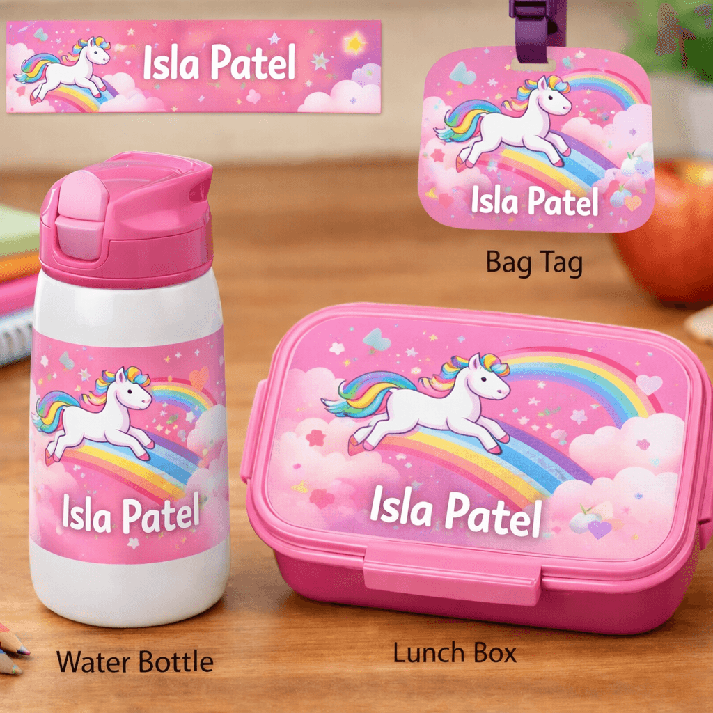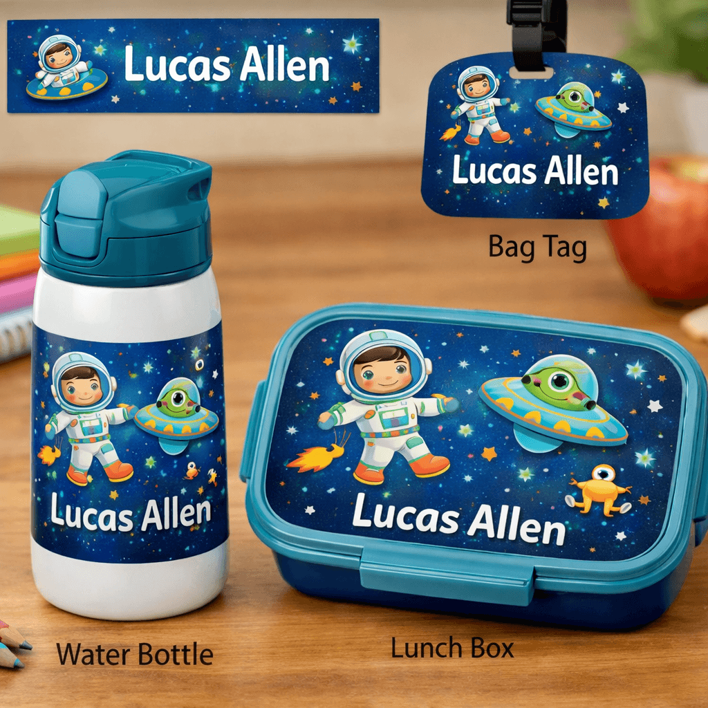 Get everything your child needs in one premium set with this all-in-one bundle. Each product is personalized with your child’s name for a coordinated and stylish look. Crafted with durable, waterproof materials and high-quality printing, this combo ensures easy identification, safety, and everyday convenience. Perfect as a personalized gift for kids.